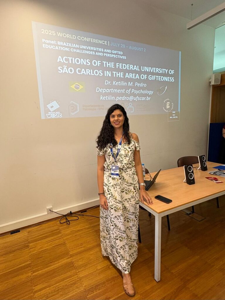 A Dra. Ketilin Pedro, do Departamento de Psicologia da Universidade Federal de São Carlos, participou de 29 de julho a 02 de agosto na cidade de Braga/Portugal do evento mundial sobre Altas Habilidades/Superdotação intitulado “The 26th Biennial World Conference of the World Council for Gifted and Talented Children”. O evento configura-se como um dos mais importantes do mundo, sendo que reune pesquisadores e demais profissionais da Educação de todos os continentes. No referido evento a professora teve a oportunidade de divulgar as atividades de ensino, pesquisa e extensão que vem desenvolvendo sobre a temática das Altas Habilidades/Superdotação.